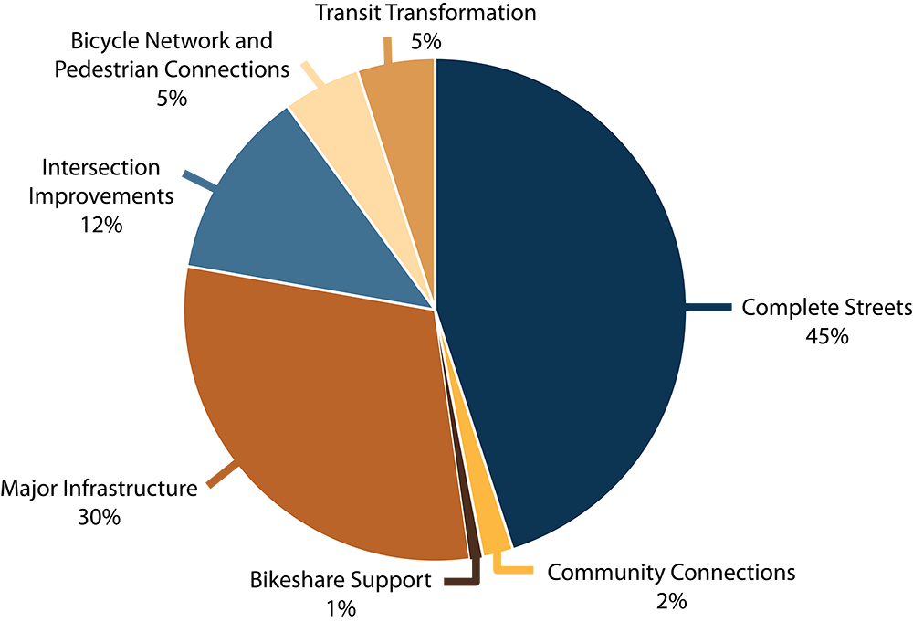 Projects in the Community Connections Program include those in the following subprograms: Bicycle Racks, Bicycle Lanes, Bikeshare Support, Microtransit Pilot, and Wayfinding Signage.